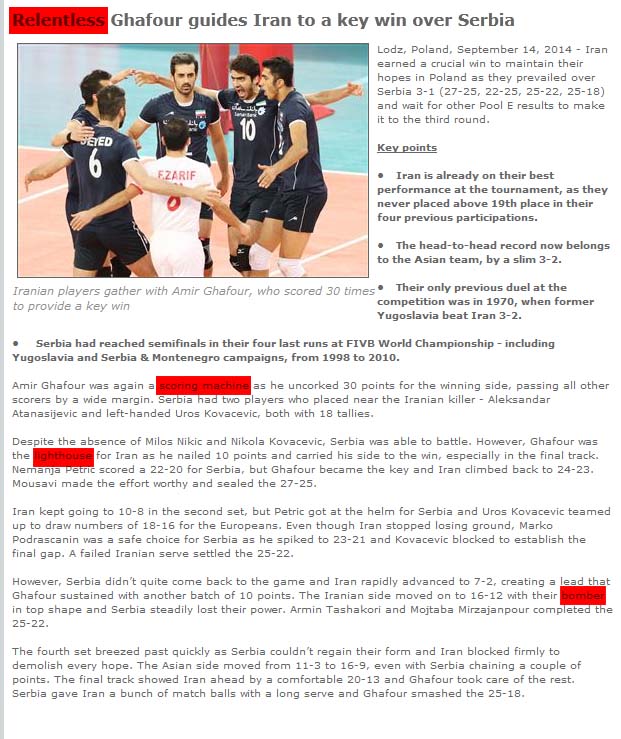 سایت FIVB خبری که درباره ایران زده بود رو نمیدونم کی نوشته بود اما هر کی بوده معلومه که خیلی تحت تاثیر غفور قرار گرفته بود. (البته درستشم همینه!)